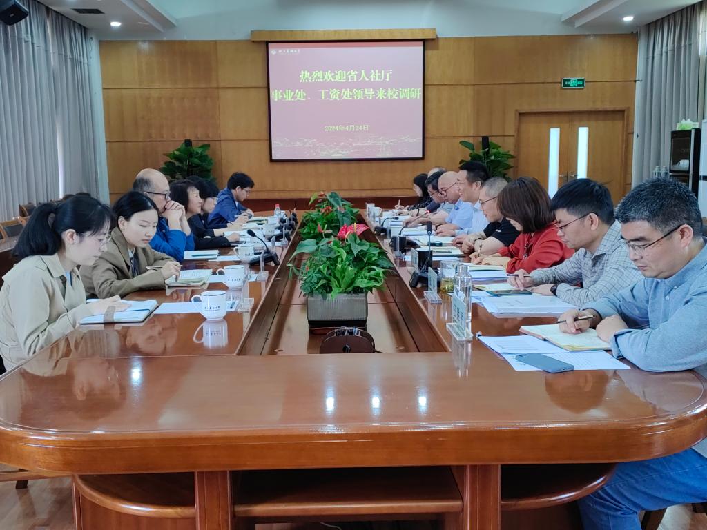 4月24日上午,省人社廳事業處處長俞韻、工資處處長毛江萍一行來校調研,人才辦、人事處相關人員陪同調研,會議由副校長徐愛俊主持。