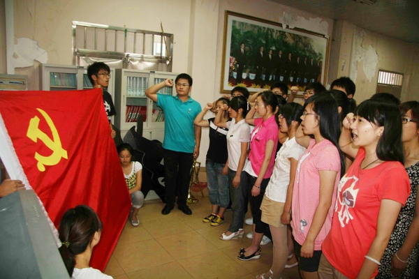 6月29日,經濟管理學院部分90后學生新黨員,面對黨旗宣誓入黨。在中國共產黨成立90周年即將到來之際,學校各級黨組織紛紛組織黨員、入黨積極分子開展活動,通過入黨教育、重溫黨史等形式,表達大學生“永遠跟黨走”的信念。 (天衣 /攝)