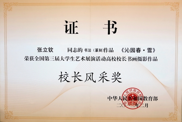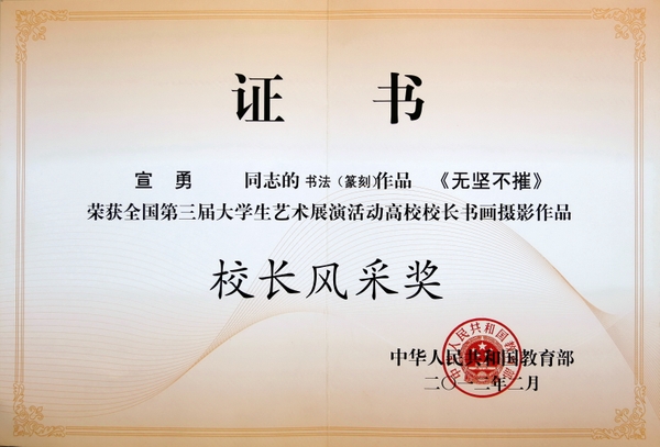 日前,由教育部主辦的全國第三屆大學生藝術展演活動勝利閉幕。在本次大藝展高校校長書畫攝影作品展上,我校黨委書記宣勇教授的書法作品《無堅不摧》,黨委委員、副校長張立欽教授的書法作品《沁園春·雪》,校黨委委員、工會主席汪士華教授的書法作品《厚德載物 自強不息》均榮獲校長風采獎。