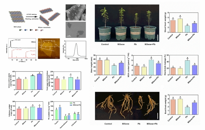 研究結果表明,在土壤中施加MXene后,可以有效抑制香榧體內鉛離子的積累,從而增強香榧幼苗對鉛脅迫的耐受性。該團隊的進一步研究,則揭示了MXene抑制香榧體內鉛離子積累的作用機制:一方面,土壤中MXene通過其吸附能力,將土壤中有效態鉛轉變成穩定態,從而減少香榧幼苗對土壤鉛的吸收;另一方面,MXene通過調控香榧根中果膠合成/代謝相關基因的表達來提高果膠含量,進而將更多的鉛離子固定在根細胞壁中,最終減少香榧體內鉛離子積累。