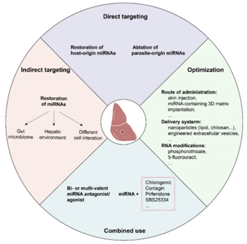 由于miRNAs在寄生蟲感染誘導的肝纖維化中發揮重要功能,所以可利用病毒和非病毒遞送系統,作用于那些直接參與纖維化的miRNAs,抑制HSC的活化,促進纖維化消退;同時,也可靶向與腸道菌群、肝臟微環境和肝臟不同細胞間互作相關的miRNAs,研制新型抗纖維化藥物。為了獲得更好的藥效,需要研制二價或多價miRNA藥物,也可聯合使用miRNA藥物和其他抗纖維化蛋白或化學藥物。在此基礎上,通過優化遞送系統、給藥途徑及RNA修飾等,再進一步提高抗肝纖維化miRNA藥物的療效。